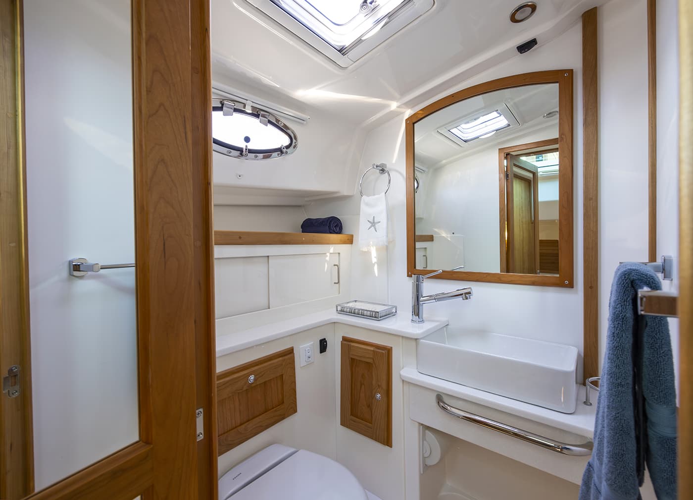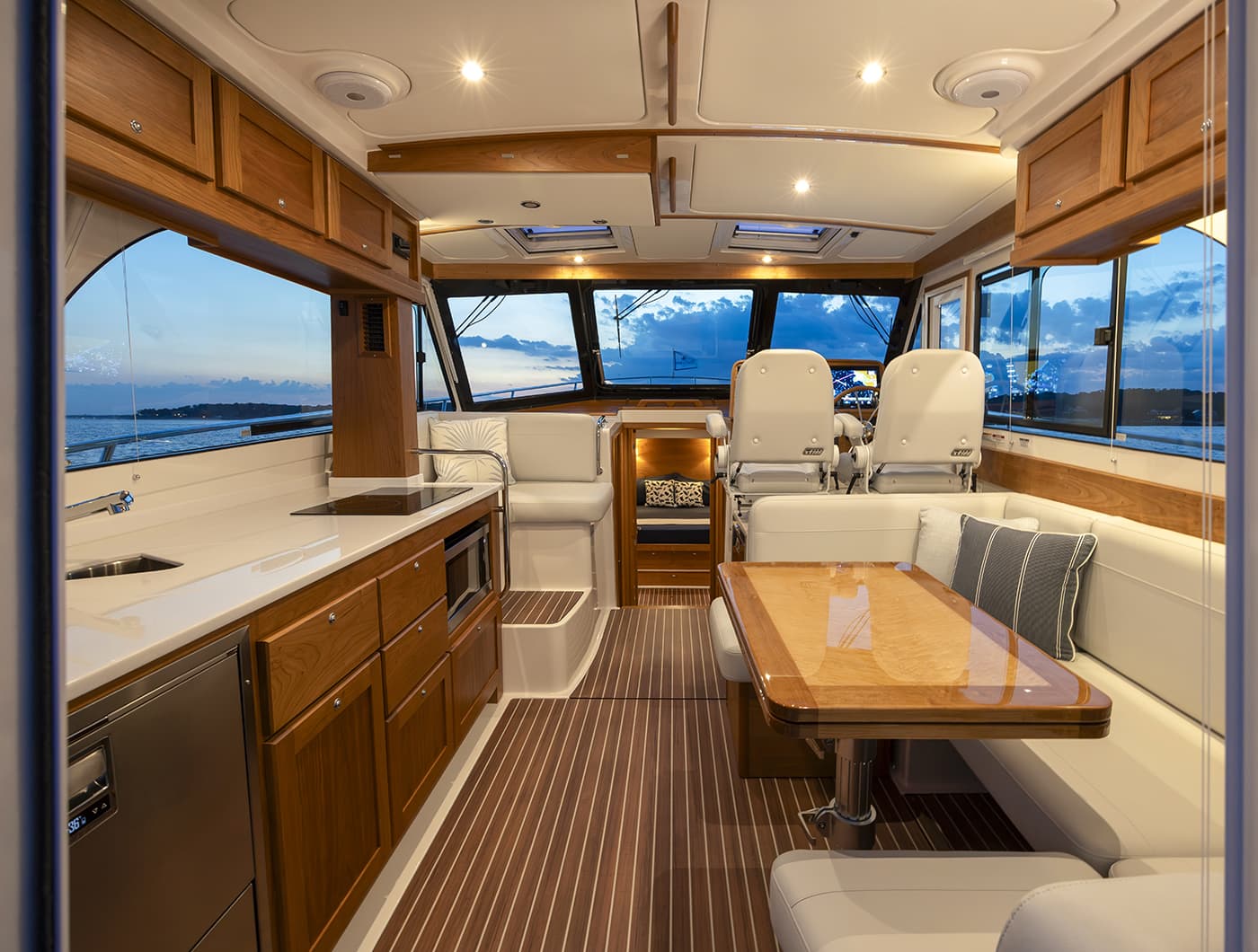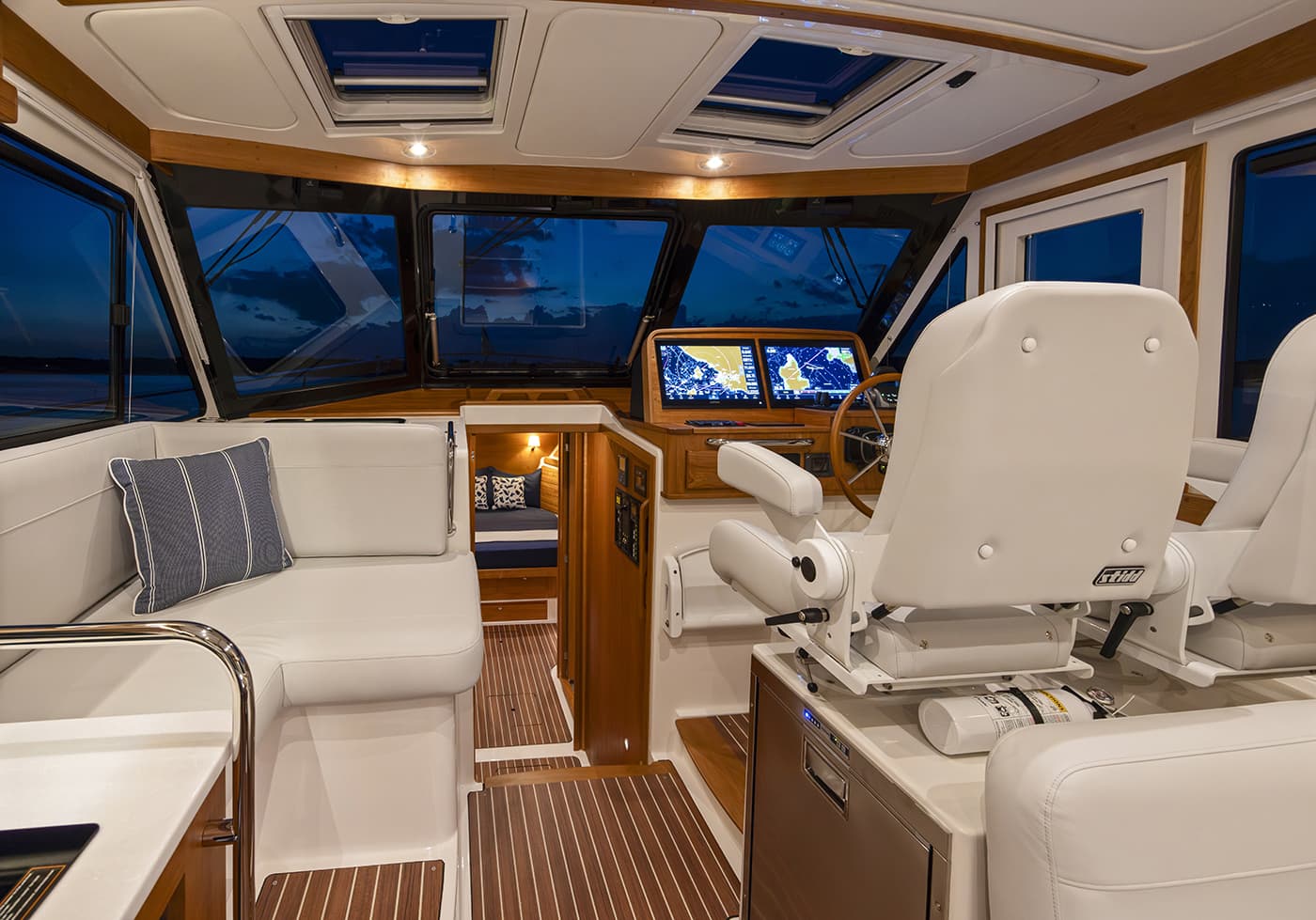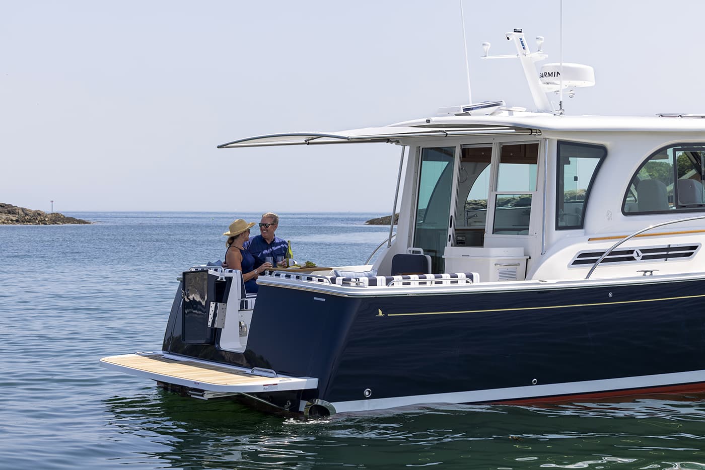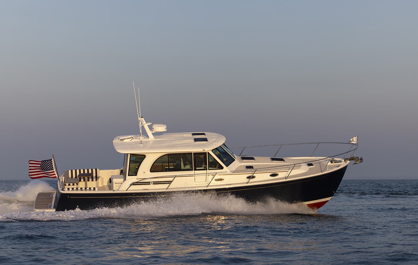 As a small luxury yacht, the 412 features direct-bonded pilothouse windows, a full-height helm door, and an updated salon with a power sliding window. Owners can tailor the cockpit to their lifestyle, choosing between dual aft seats or an aft-facing seat with integrated grill cabinet. New cushion designs and thoughtful system upgrades round out a boat that retains its spacious layout and classic Downeast styling while offering more comfort, efficiency, and versatility than ever before.
